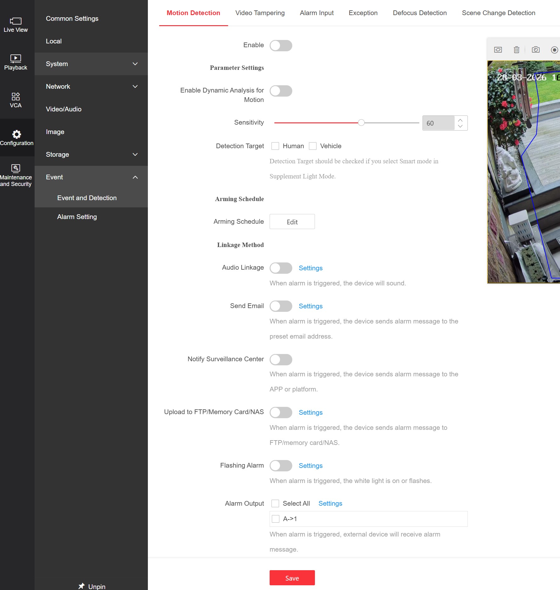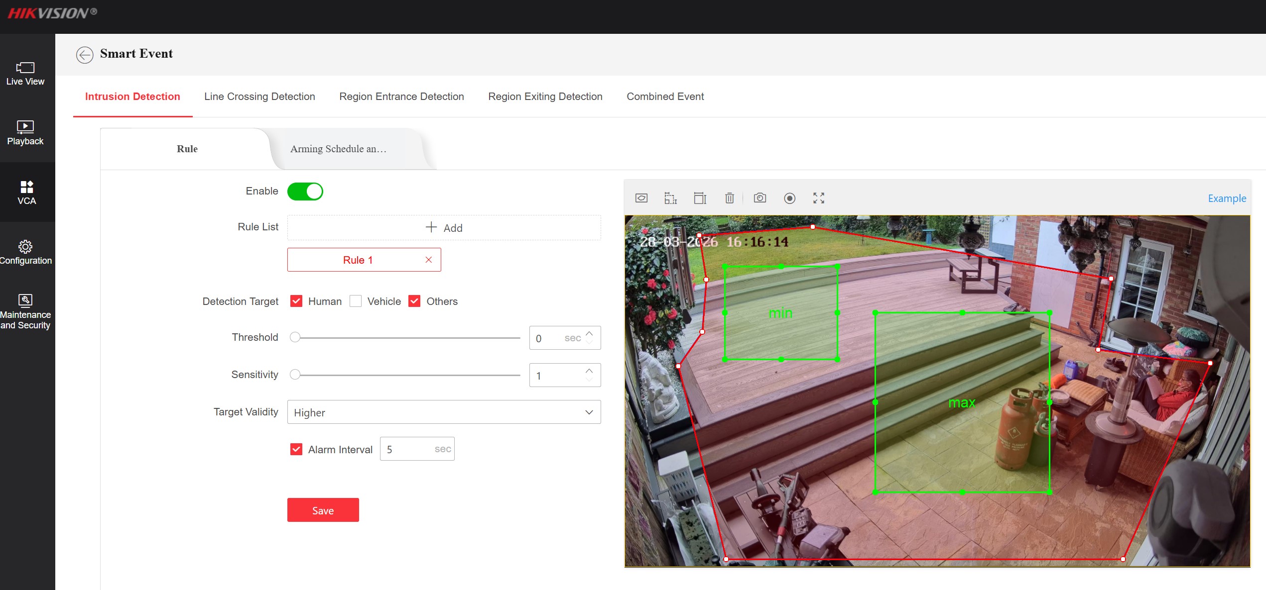 It IS correctly alerting me in Hik-Connect for fox and human sized activity, but IN ADDITION it is also recording all the small birds on the lawn (but not notifying). In the playback it's clear to see the green boxes for the birds are way smaller than my minimum size box. I've also tried lowering the sensitivity as seen. AcuSeek is enabled under General Settings. Not using NVR.